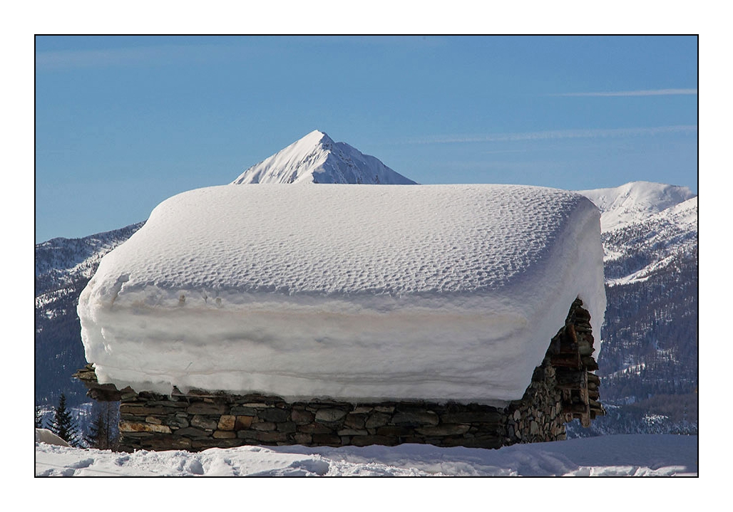 Fantastico questo candido tetto di neve e bellissima la lontana vetta che ne emerge.Molto più di una semplice cartolina
