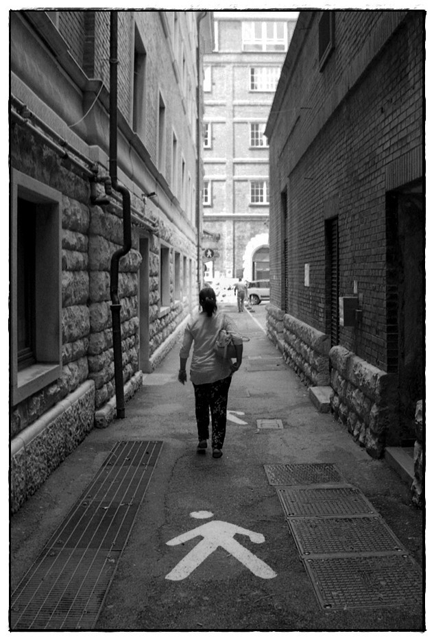 ...A cui si aggiunge quello del cartello in fondo al vicolo. Una zona pedonale che diventa un corridoio prospettico, scandito da un ottimo b/n.  |