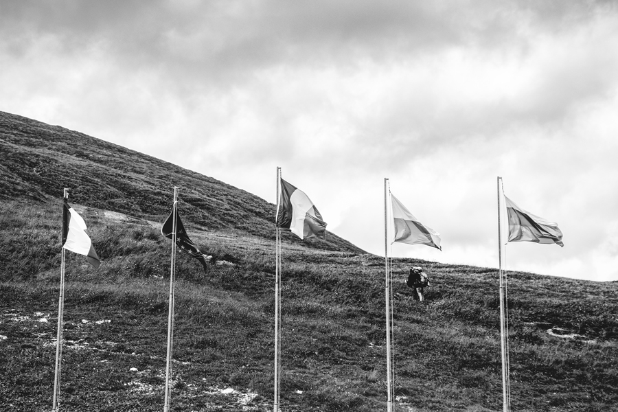 per il B/n va bene, però avrei due soli appunti: avrei cercato di riprendere le belle bandiere in modo da avere i tessuti svolazzanti completamente inscritti nello sfondo scuro del pendio, oppure integralmente contro il cielo chiaro. La scena avrebbe avuto lo stesso impatto e naturalezza narrativa nel contesto , ma più pulizia. La presenza umana in sfondo è piccola e indistinta, e appare allora come troppo casuale nella scena. Avrei atteso la loro uscita di scena.