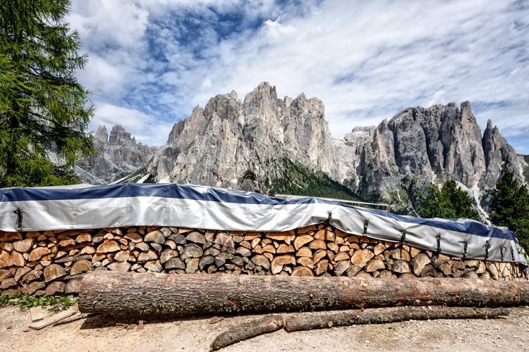 Particolare scorcio paesaggistico con l'inserimento in pp della legnaia. Il telone bianco blu richiama i toni delle belle vette dietro e del cielo.