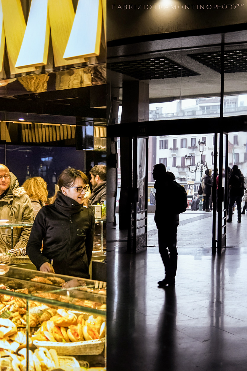 No, non sono due scatti. Un buffet alla stazione di Venezia presenta un'ampia colonna specchiata. Lo scatto pero l'ho elaborato separatamente per "tirar fuori" di più dallo specchio. Il cliente scattando non l'ho nemmeno considerato, hai ragione, peccato, ma a volte la velocità di catturare non lascia il tempo....