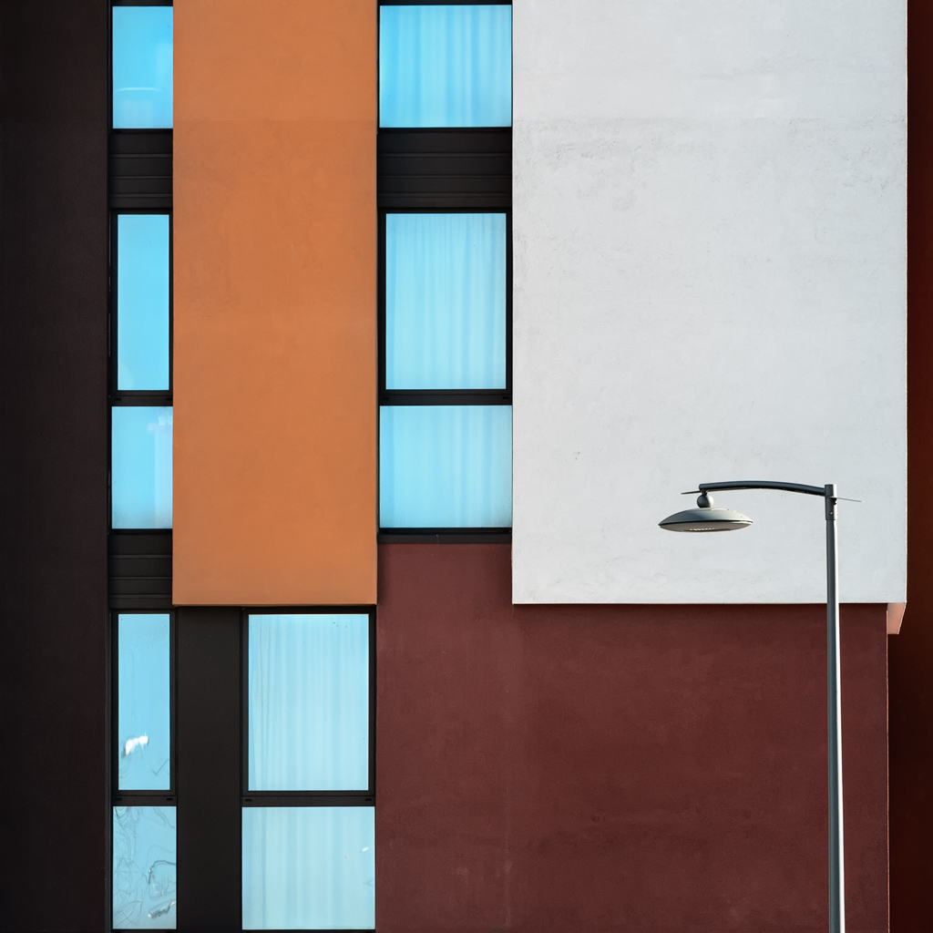 Combinazione di forme e colori molto piacevole. E la sagoma moderna e sottile del lampione a lato, fa da regia al tutto.