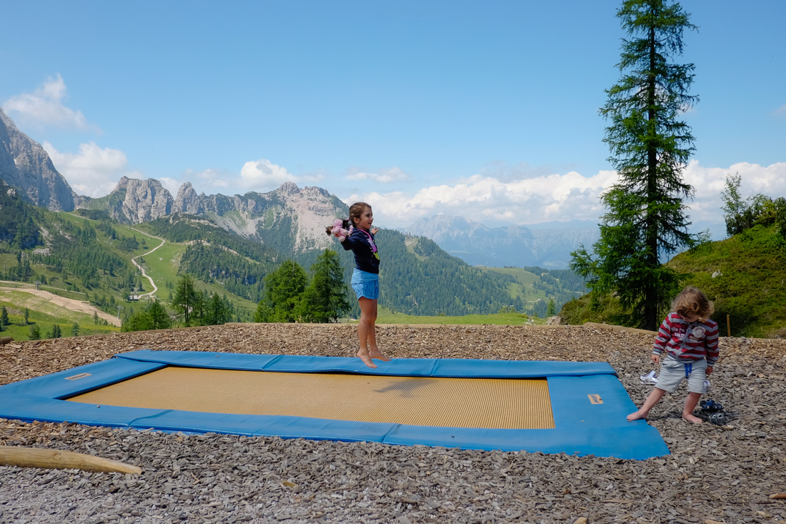 Eh eh... non è ghiaia ma legnetti. All'arrivo e alla partenza degli impianti ci sono spesso un sacco di "giochetti". I tappeti elastici sono frequenti. Qui essendo una passeggiata per famiglie abbastanza battuta lungo tutto il percorso sono disseminate le cose più improbabili (Vespe, barche, ecc.) . A fianco, non inquadrato in questo spiazzetto, c'è uno scivolo di plastica che riproduce il campanile di San Marco (!!!).