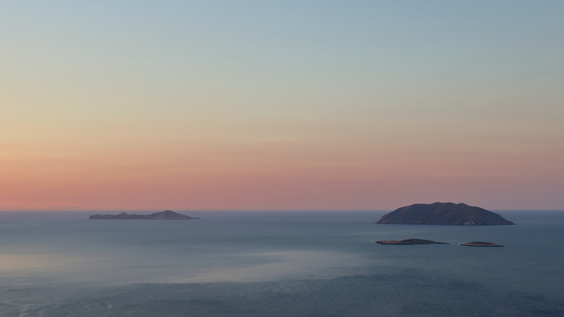 La vista puo' spaziare verso l'orizzonte e verso le due isole,che condividono lo stesso braccio di mare ,allo stesse tempo sono vicine ma diverse fra loro.I volumi sono diversi dei profili in controluce e di conseguenza anche il peso visivo,nei sui effetti sullo sguardo,ma l'immagine mantiene un certo equilibrio.Le creste montuose sono piu' imponenti da un lato e si puo' avvertire mentre si sposta lo sguardo,che porta l'attenzione anche laterlalmente,(teoricamente un filo defilata)rispetto alla zona centrale larga di massima attenzione.