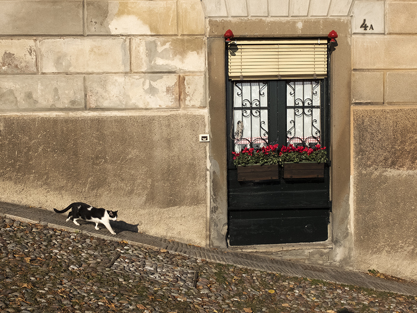 Bella composizione con il gatto dal passo felpato che si muove sulla interessante diagonale.Ottimi i colori e la luce. Ok!