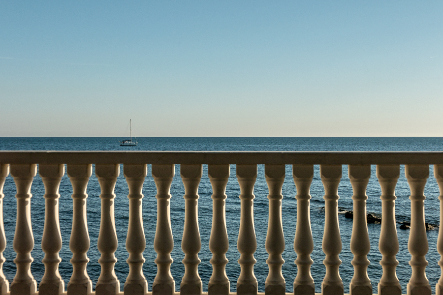 Inoltre, mentre la metà superiore è vuota, nella metà inferiore ci sono, a mio avviso, troppi elementi: le colonnine, il mare increspato (quindi con "tratteggio" discontinuo"), gli scogli affioranti, la barca.