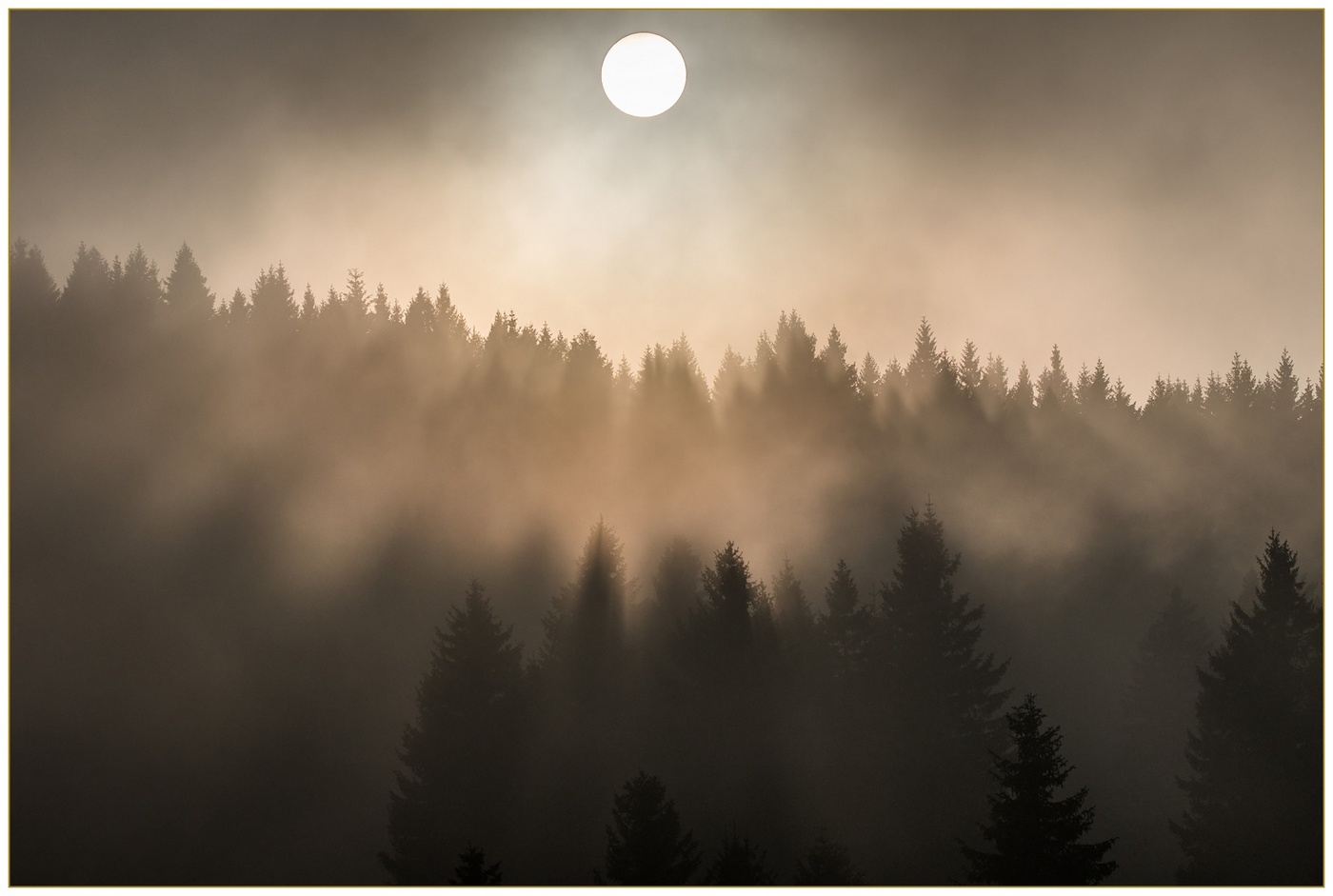 Spettacolo, magia totale: la schiera silenziosa di cime alberate fra le nebbie, che rende omaggio alla maestà circolare di una divinità silvestre, che regala la sua luce!