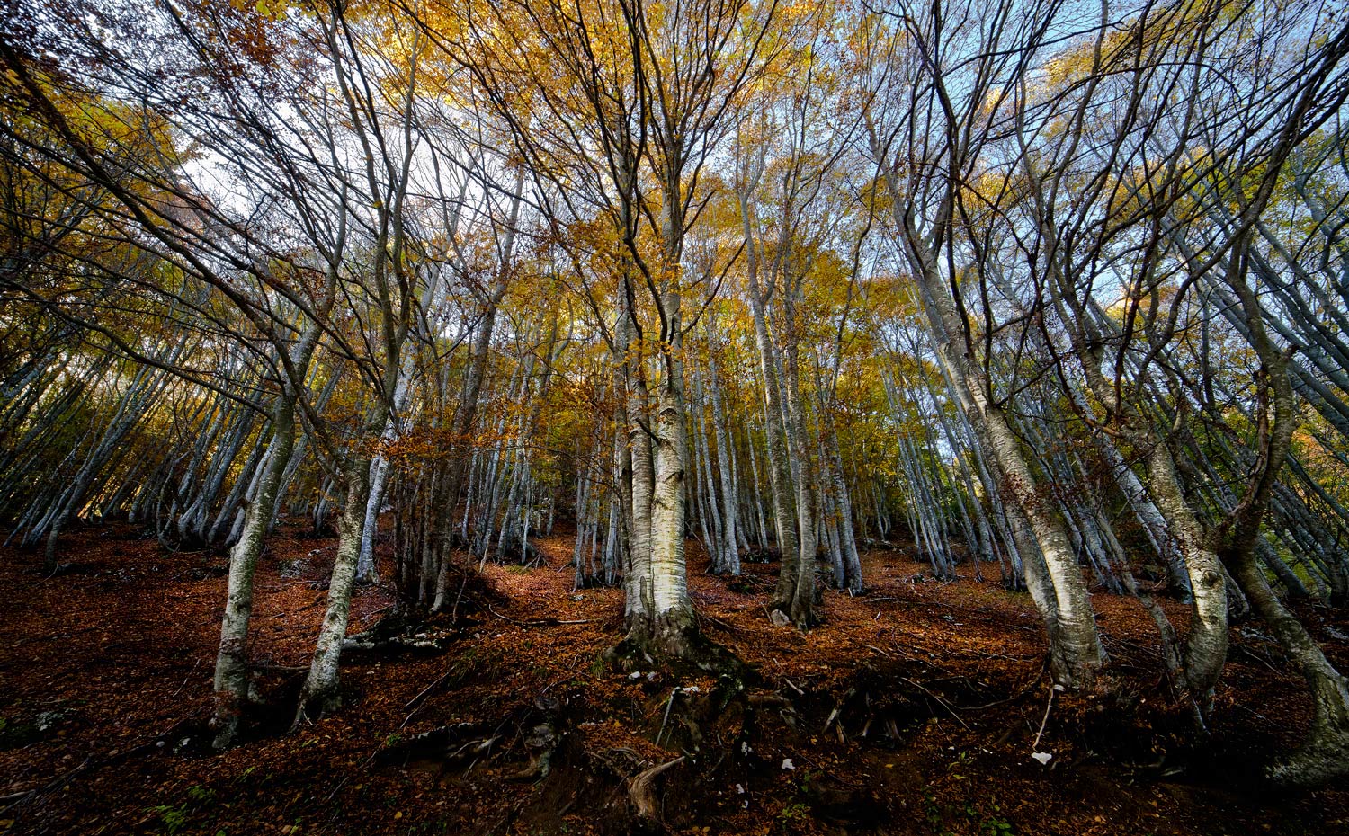 Scatto meraviglioso CLaudio. Quanta potenza in questa distorsione che da le vertigini e la luce che illumina i tronchi e ogni singola foglia con colori brillanti e autunnali. Un esercito di alberi che fuggono verso l'alto e con un piede che profuma di terra, funghi e castagne. Ottima Ok!