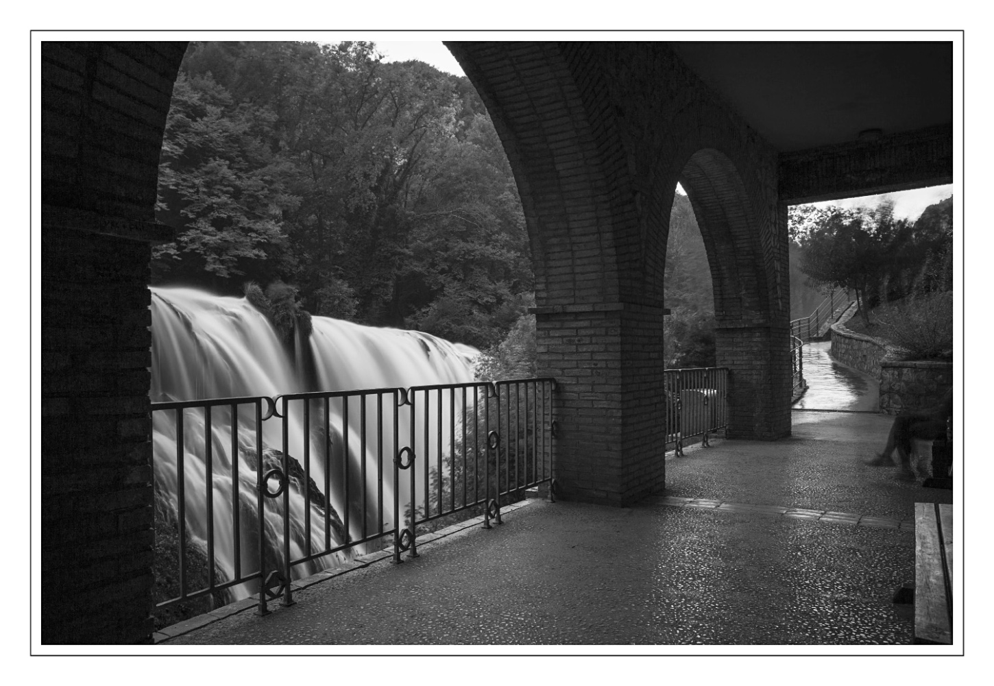 mi piace questa schiumosa cascata incastonata tra l'arcata e la ringhiera, la composizione con la via bagnata verso una probabile uscita...mi piace meno l'arco in primo piano tagliato in alto...le gambe mosse che spuntano sulla dx lasciano percepire la persona che li seduta si gode lo spettacolo ma, a mio modesto parere, se la persona fosse stata tutta visibile l'immagine sarebbe stata più completa. (IMHO)