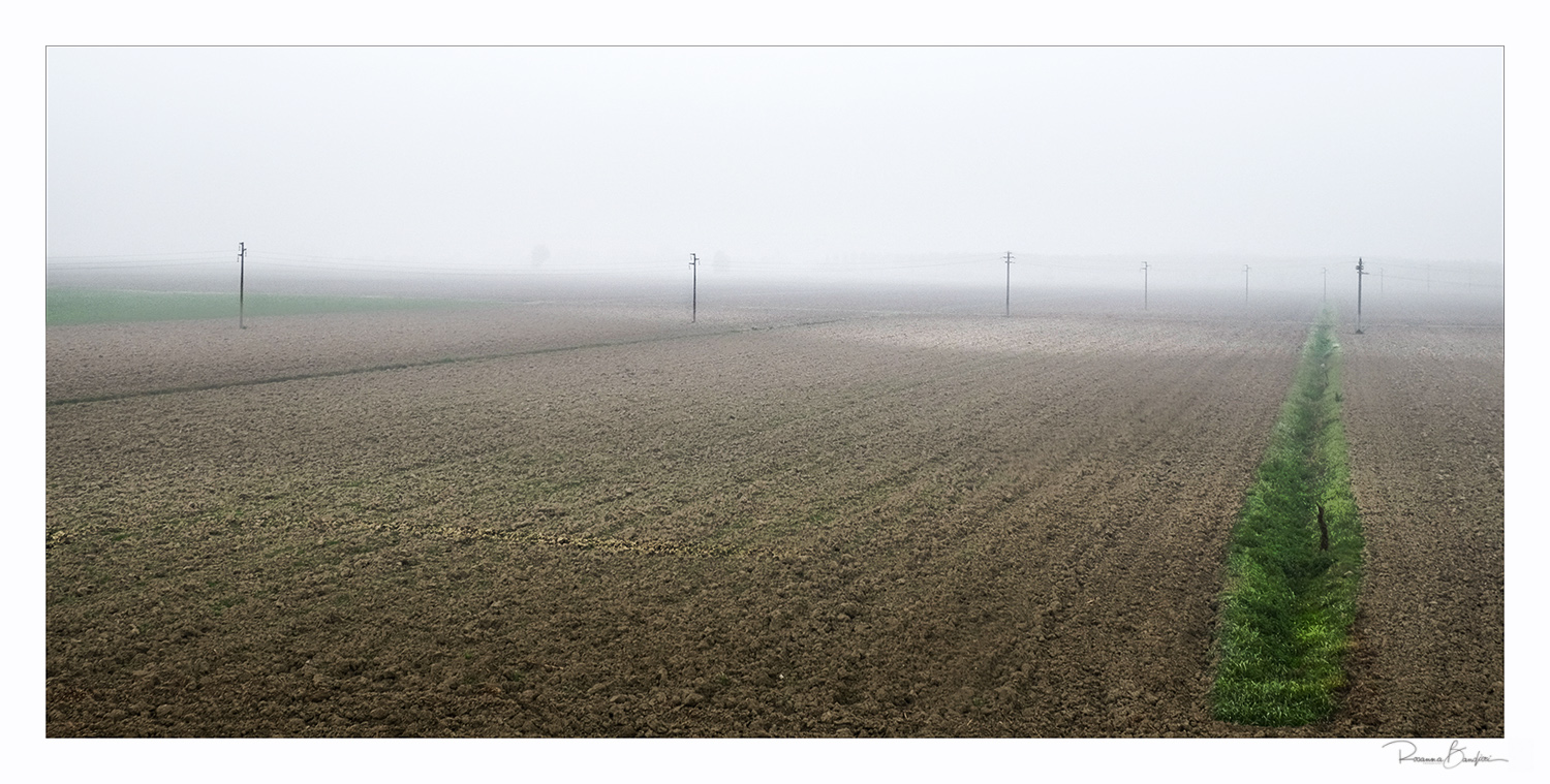 E così i pali della luce si trasformano in minuscole sentinelle dei campi. Mentre l'erba delicatamente verde emerge dalla terra, grassa e ricca, come un solco di fertilità.