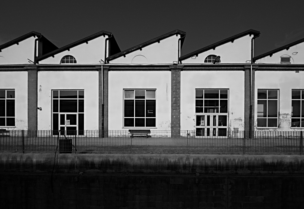 Un bianco e nero certo non classico: i banchi sono assolati... (se mi posso permettere il termine), eppure come spenti , e senza dettaglio inciso , o decifrabile trama della struttura o delle vernici e granulosità dei muri. Spiccono con maggior forza, in paragone, le linee rette e le geometrie degli infissi chiari, a delimitare vetrate che si riempiono di neri quasi assoluti, di silenzio e di assenze. Conversione funzionale al messaggio, con oscurità di cielo e di interni, come se ogni cosa fosse irrimediabilmente sospesa , e persino l'aria avesse una densità ed un peso. Proposte di Teresa come sempre particolari, piccole sfide visive e mentali, punti di partenza di interrogativi e riflessioni.