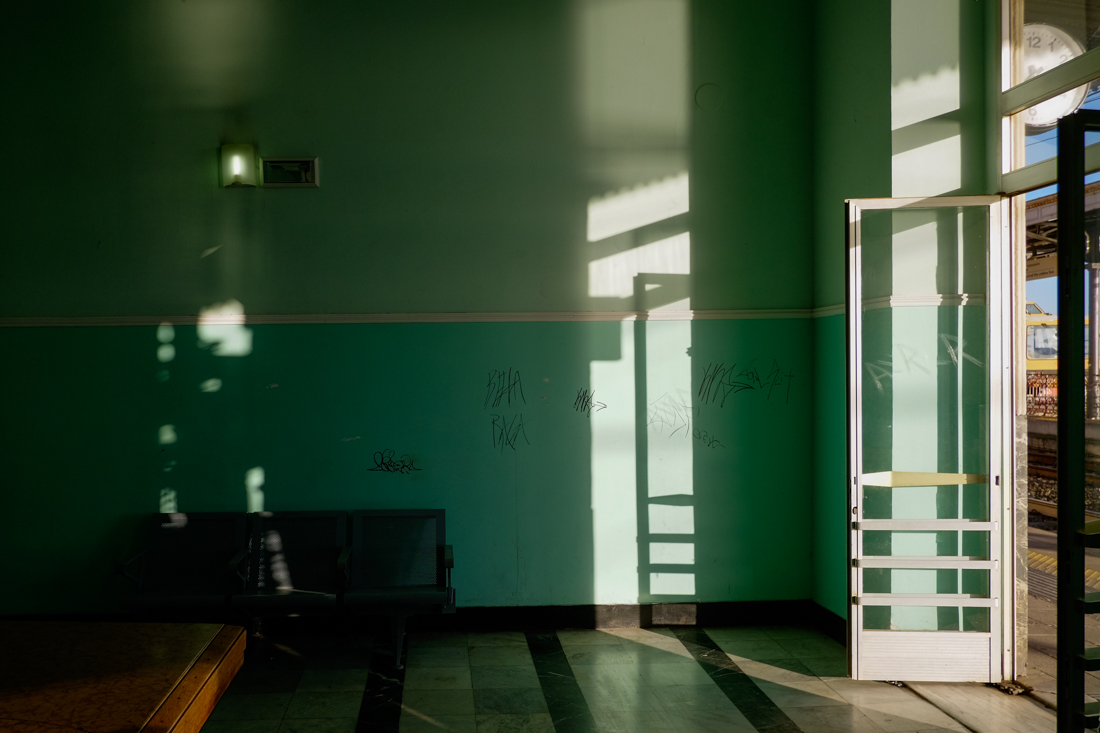 Incantevole atmosfera per questa sala d'aspetto. Un luogo sospeso tra andata e ritorno in cui anche il tempo pare stia aspettando. Tinte perfette per sottolineare ogni particolare, dalle scritte sui muri ai giochi di luce sulle pareti. Quelle porte aperte che raccontano chi esce e chi entra.