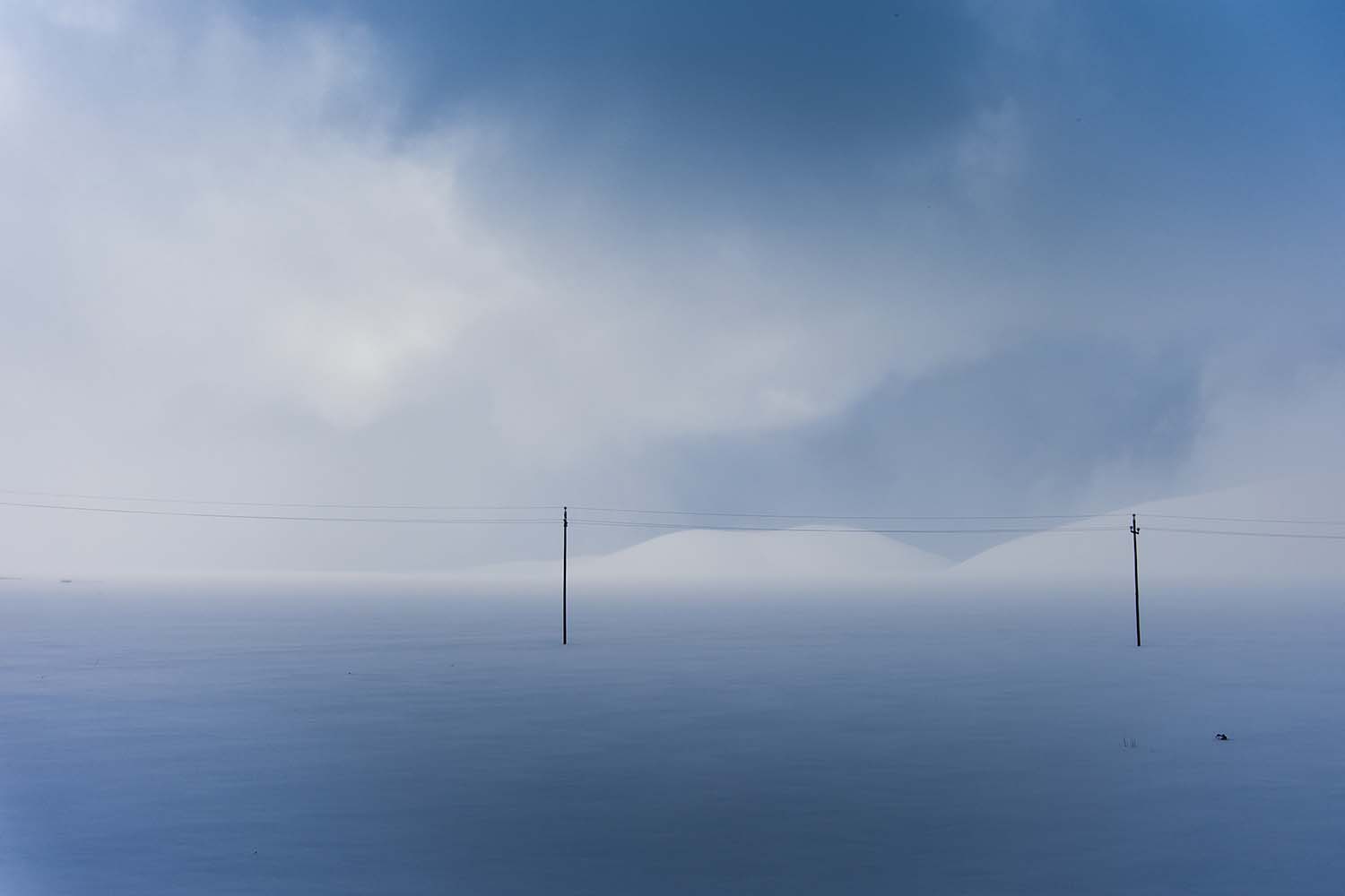 Un immagine candida,al limite del surreale,la distesa di neve dai toni azzurrini potrebbe essere scambiata benissimo per un grande lago.Laggiù in fondo solo le montagne innevate riescono a definire l'orizzonte.I pali della luce a testimonianza che c'è vita.Sicuramente,io per prima,siamo abituati a vedere immagini del Pian Grande in versione estiva durante la fioritura,più raramente con la neve come da te proposto.Mi piace.Un saluto,Marianna