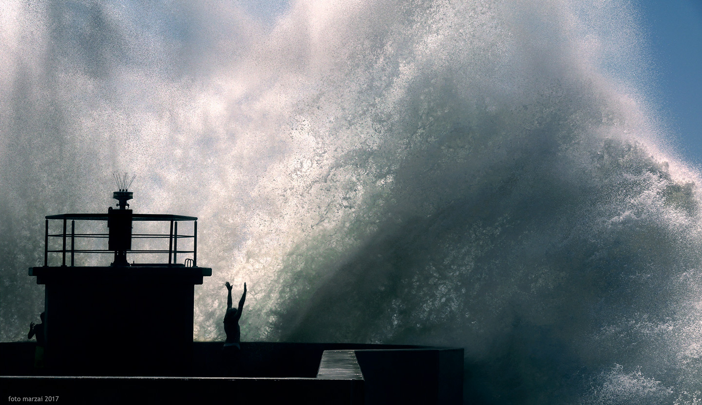Ieri, mi era sfuggito il titolo... la piccola figura umana sembra voglia evocare e sottomettere la potenza sovrastante del mare. Bellissima e suggestiva.
