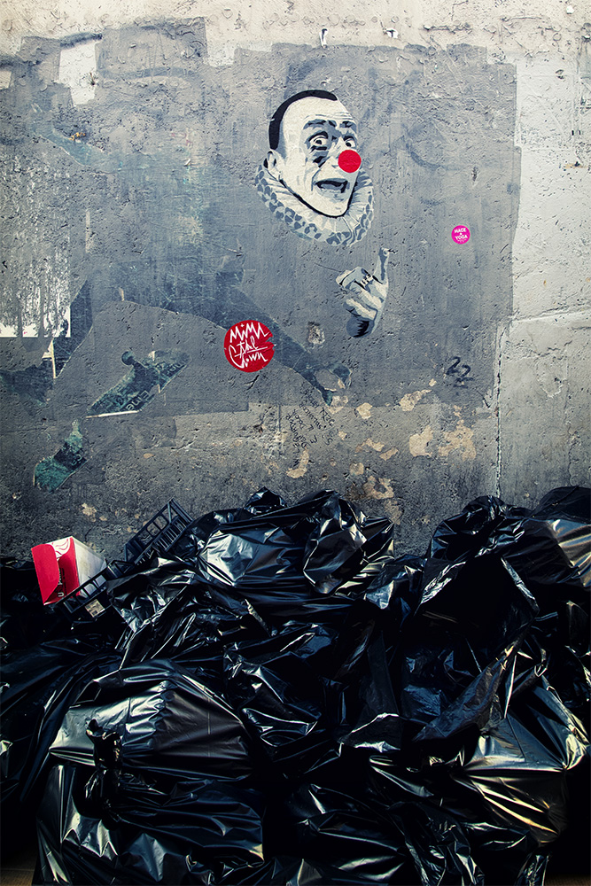 | Bellissima immagine con quei tocchi di rosso e l'espressione del pagliaccio che,con lo sguardo in macchina,sembra voler denunciare lo scempio con il quale deve convivere.Complimenti e preferita.  _________________