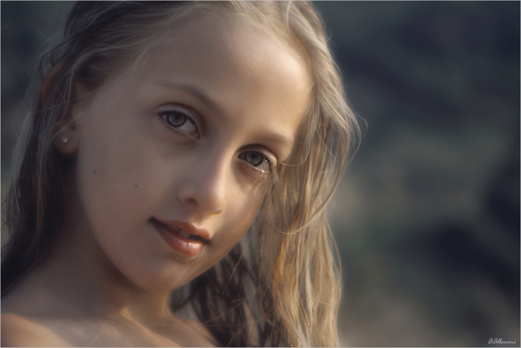 Trovo davvero dolcissimo questo ritratto. Lei ha un viso delicato,accarezzato da una luce calda. Occhi profondi e sorriso timido e verso di te uno sguardo forte e tenero, curiosa e consapevole.Tutto è tenuto molto morbido,e credo sia una scelta azzeccata.Forse però scalderei un po' i toni, soprattutto guardando la parte del viso che rimane in ombra.