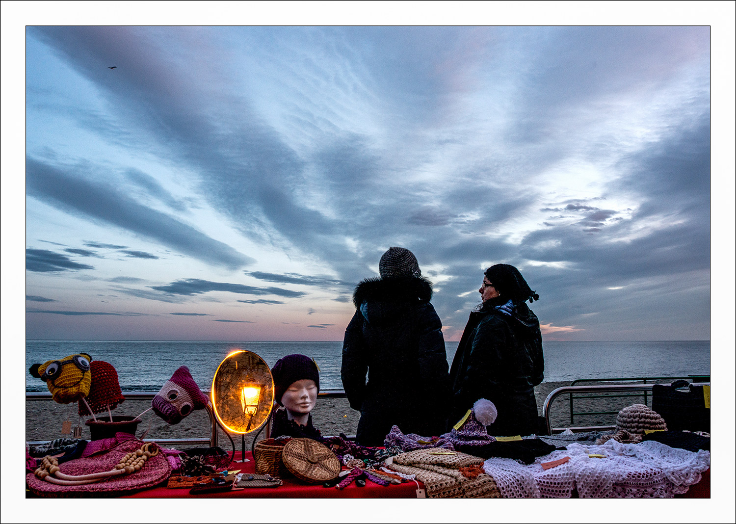 | Nelle tue foto mai nulla è lasciato al caso.Il lampione acceso trova spazio,riflettendosi nello specchio,tra berretti e scialli,indispensabili accessori vista la stagione.Il cielo merita l'ampio spazio che gli hai dedicato sia per le belle nuvole che per i tenui colori del tramonto.Le due donne di spalle,forse le venditrici,si godono questo spettacolo della natura.Mi piace.Un caro saluto BrunoBrown da Marianna. |