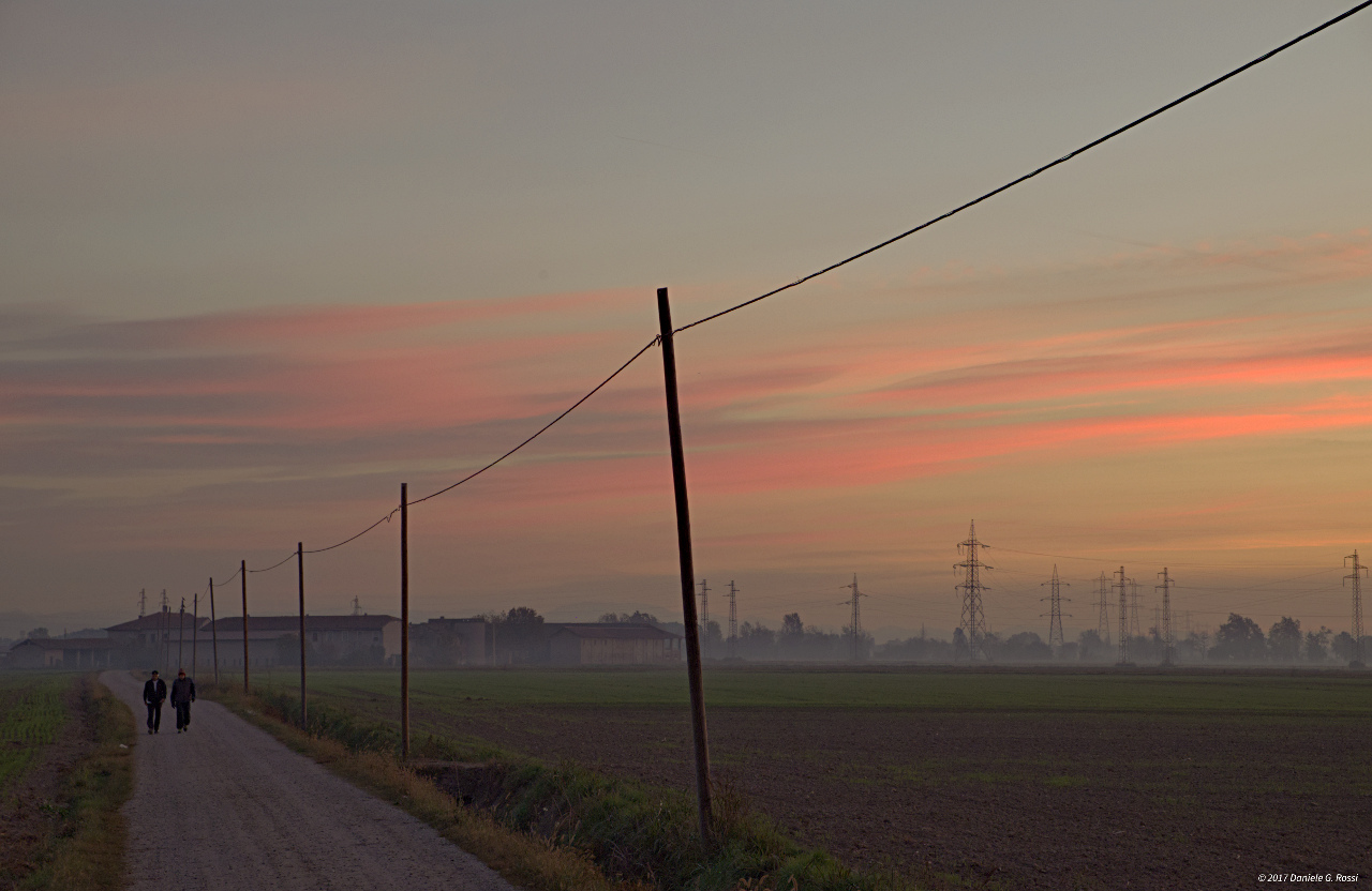 Bellissima! Mi piace sotto ogni aspetto, le delicate cromie delle prime luci dell'alba,con i suoi colori pastello e la sua foschia ,che rendono pittorico lo sfondo; la composizione,con questo filare di pali a dare profondità e accompagnare il sentiero e poi l'inserimento delle due figure umane,che iniziano il loro viaggio...