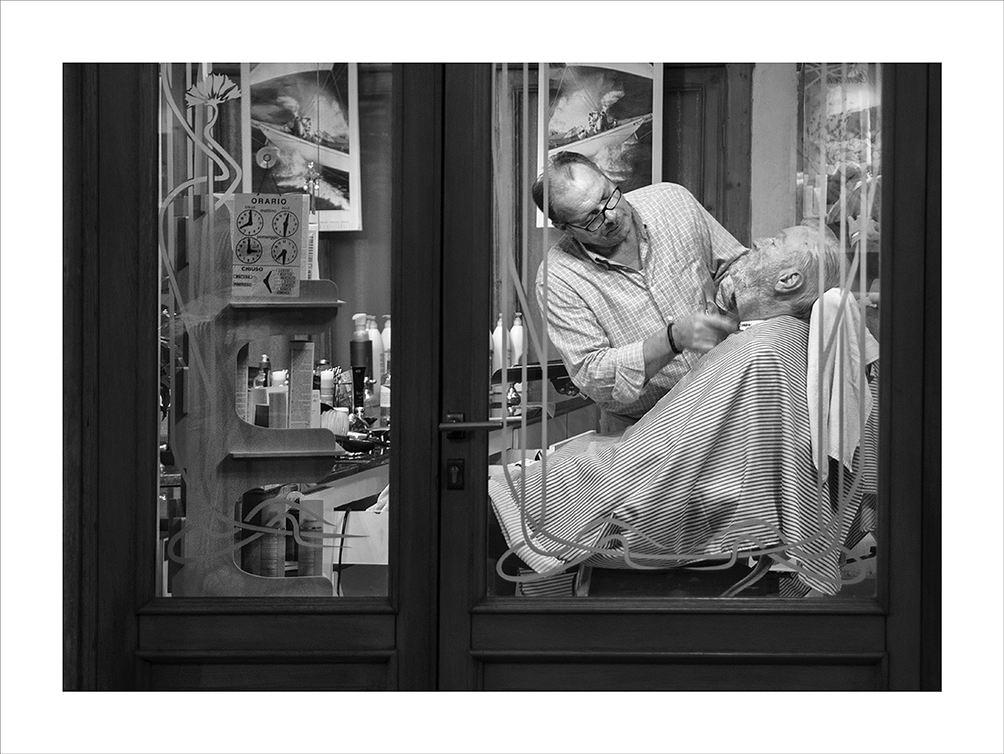 Carinissimo il momento colto. Bella la mantellina del cliente a righini e la camicia del barbiere a quadratini. Si intonano fra di loro!!! Sembra una foto di altri tempi !!!