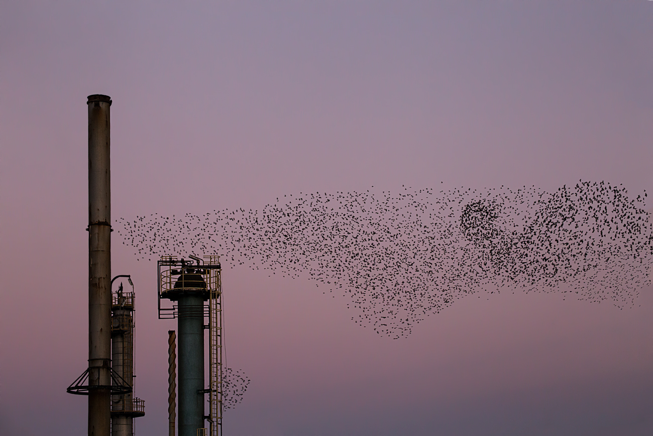 Un bellissimo gioco tra le ciminiere e gli stormi creano una nuova immagine dal messaggio ironico. Immagine splendida Nicola. Io non credo alla fortuna, il merito è sempre del fotografo. Lo ripeto da anni: se il fotografo non muove le chiappe e si reca sul posto a fotografare, la foto non andrà mai a bussare alla sua porta di casa...