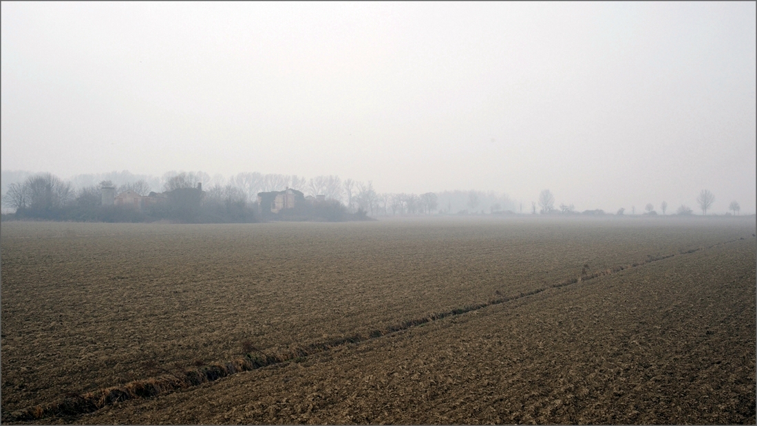 Un bel paesaggio sussurrato in cui ai campi coltivati si affiancano le cascine abbandonate. Tutto è avvolto da una leggera nebbia che sfuma i contorni ed impreziosisce l'atmosfera.