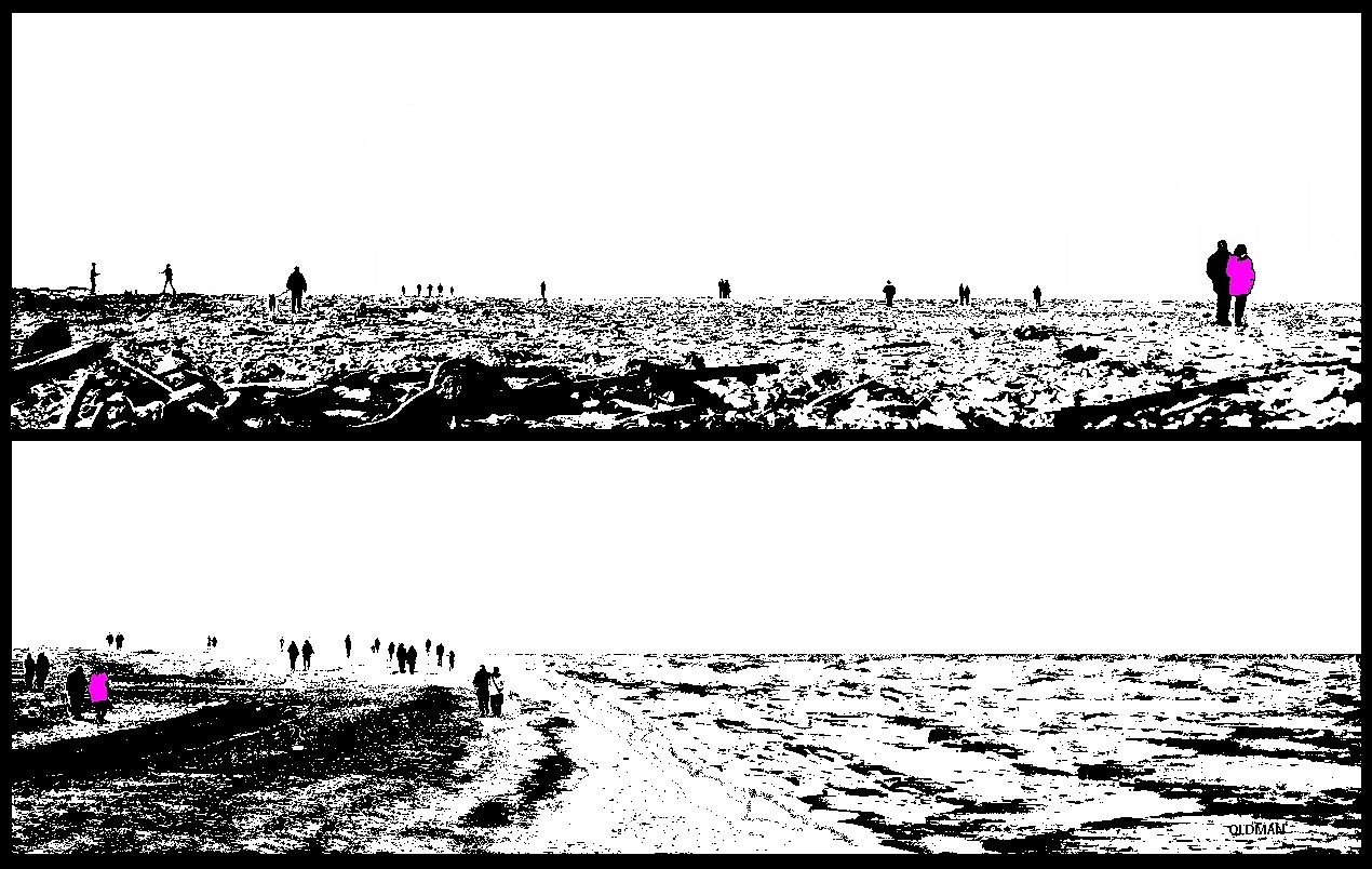 Un interessante dittico panoramico che ci mostra due riprese di un paesaggio che il grafismo rende landa desolata dove si muovono piccole figure umane quasi perse.La nota di colore forte ci permette di individuare e seguire una coppia che diviene protagonista.Si,molto interessante! Ciao