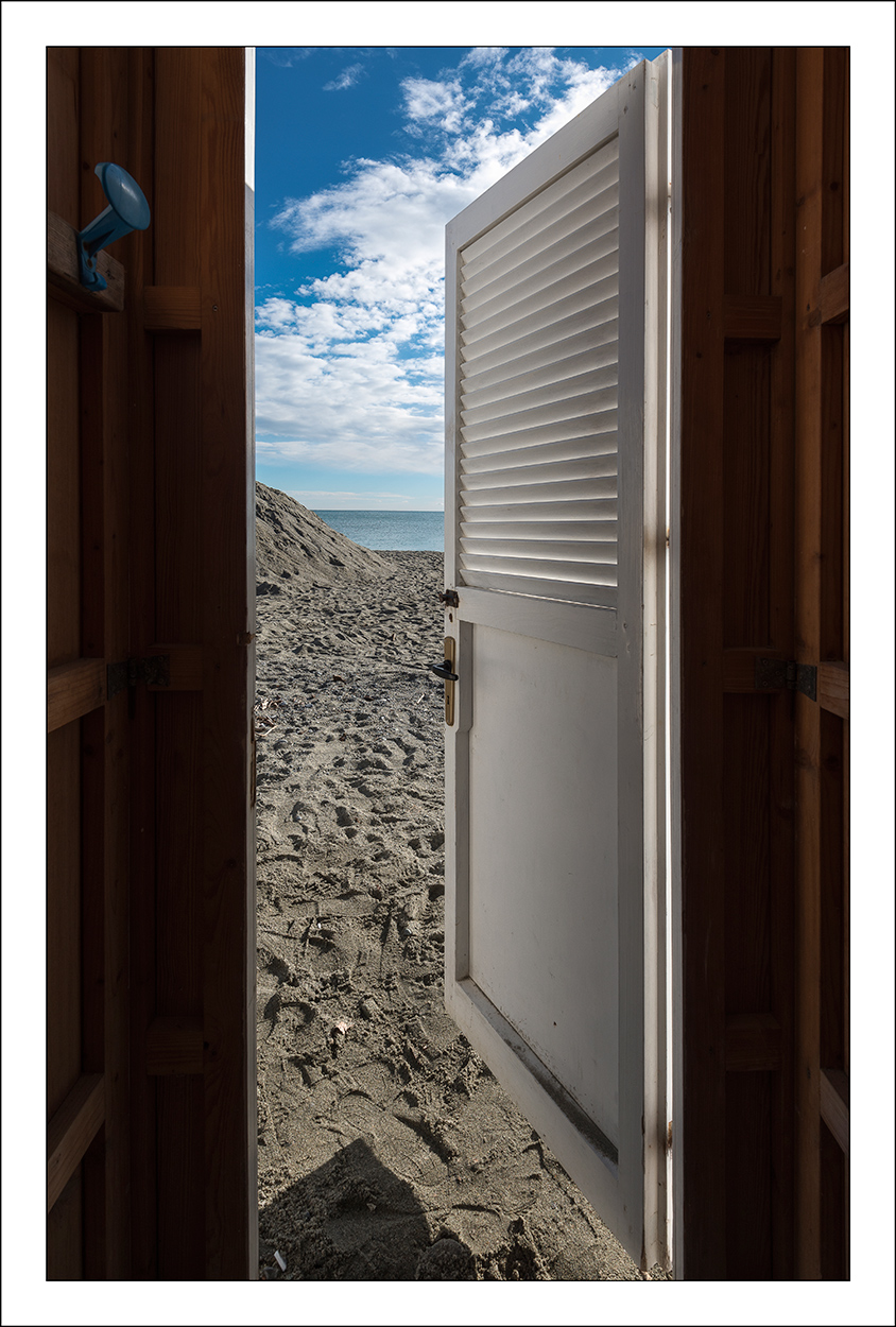 C'è un dentro accennato ma ben contestualizzato (vedi l'appendino), c'è uno scorcio di un mare invitante, c'è il tappeto di sabbia e c'è il trait d'union della porta con le sue linee diagonali.
