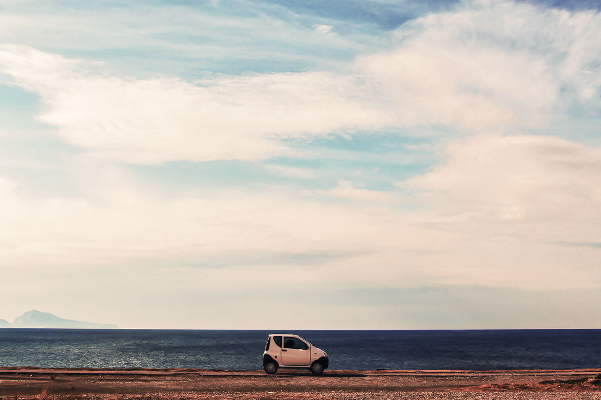 Ciao Salvatore, sembra un modellino in scala al cospetto della vastità del paesaggio. L'assenza di un preciso punto di riferimento ne fa perdere il senso delle dimensioni. La montagna estremizzata a sinistra riesce appena a farci tornare alla realtà.