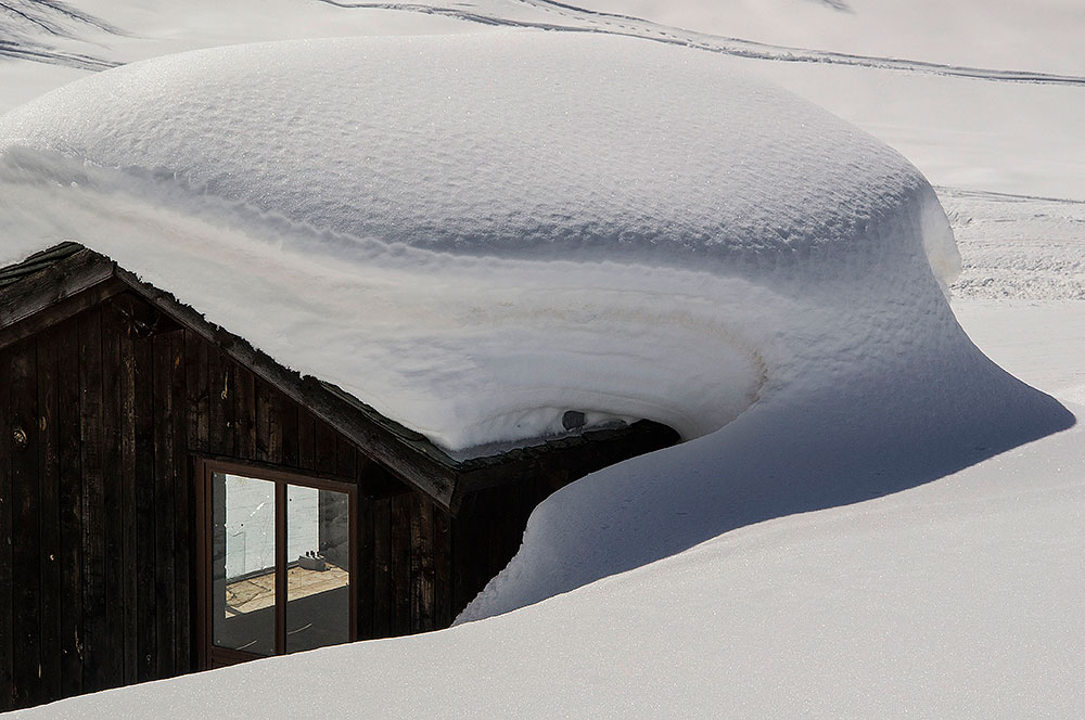 La spigolosa parte scura del fotogramma, con i legni bruni , ben contrasta con il ch chiarore della neve e soprauttto con le sue forme molli e curvilinee che suggerscono sofficità . Bello anche lo sguardo all'interno della baita circondato da questo manto invernale.