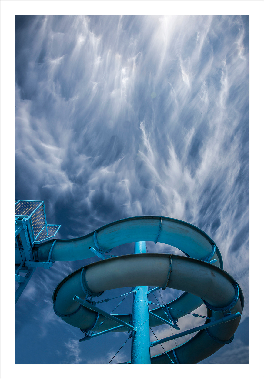 Uno scivolo che per punto di ripresa e per capovolgimento mentale sembra proiettare i suoi avventori verso una piscina fatta di cielo blu e onde di nuvole. Splendida!  |