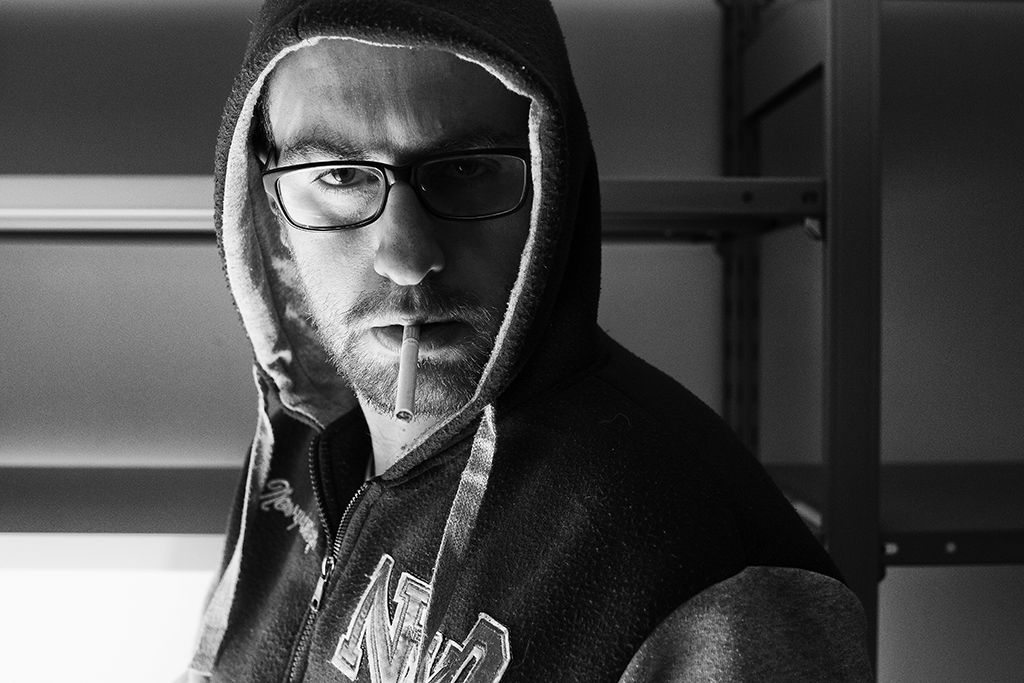 Ben auto-colto.. nella espressione e nel mood disincantato della posa. Appena un accenno di brillio all'occhio incappucciato... e poi :che luce sia per il lato opposto. La sigaretta spenta è political correct...eheh e sopratutto ti permette questi parametri di scatto. Accesa avrebbe comportato ben altre difficoltà per gestire fumo e morbidezze. La scaffalatura in sfondo è casuale ed poco estetica, ma in coerenza con il tipo di ritratto..., con la sua apparente estemporaneità .