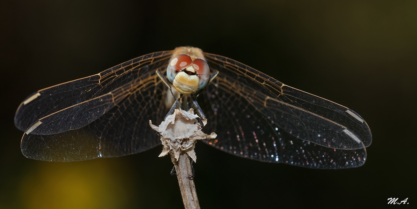 Questa fa parte delle prime macro che facevo quando mi arrivo l'obbiettivo, e dovrebbe essere una delle primissime volte che mi avvicinavo a una libellula così tanto; credo che ho scattato come sempre col diffusore del flash, ma non sapendo ai tempi regolarne la potenza avrà compensato troppo lo sfondo e quindi il lampo potrebbe essere stato troppo potente.