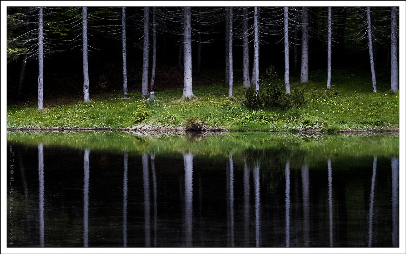 Gabbie esteriori e gabbie interiori. difficili da abbattere, ma anche affasciananti. Realtà specchiate paesaggistiche che rimandano a mio parere benissimo a qeuste avventure che scandaglio di moti dell'animo. Oscurità boschive di sponda, dove acqua scorre e rinfresca, dove ul verde vivacizza le aree di oscurità. E trocchi come ostacoli, come sbarre... Belle spechaiture vibranti, ove i rami orizzontali quesi scompaiono,e le sbarre interiori, difficili da atraversare possono però anche svanire... e farsi invisibili.