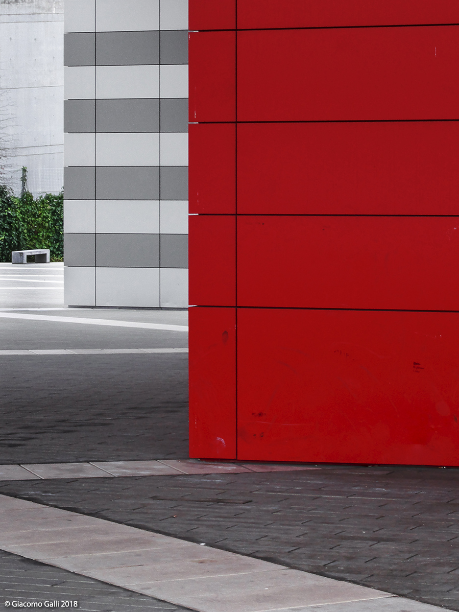 Che bella. Il grigio ed il bianco a cui tende giocano con il rosso, con la complicità dellincrocio di linee e volumi, e l'arrivo finale del verde a fondo corsa: una ottima sopresa, che contestualizza , e completa il quadro.