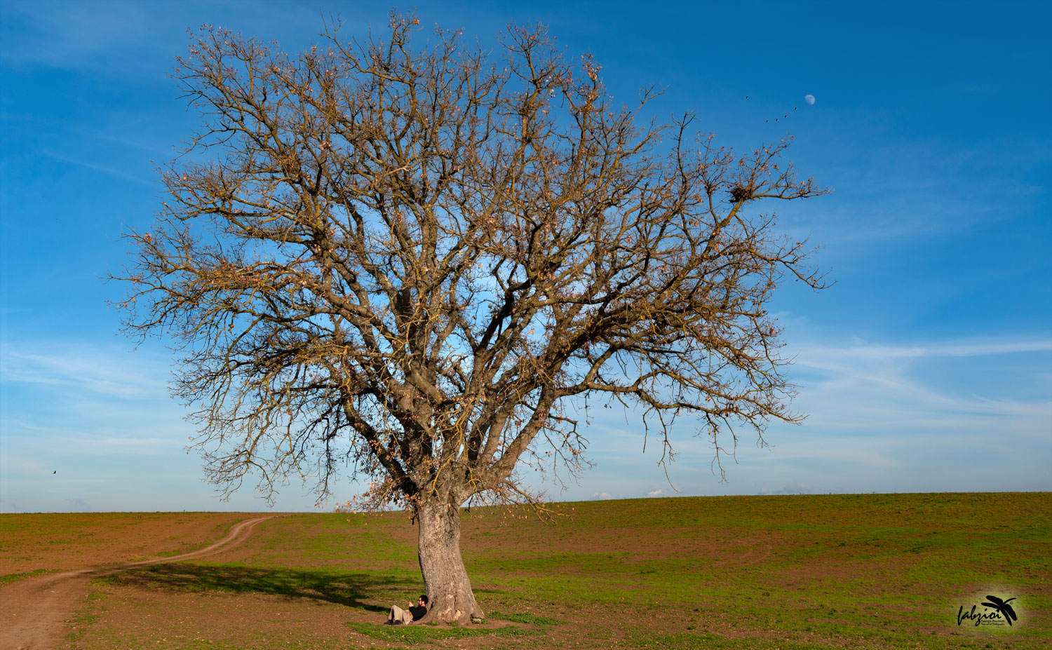 Molto bella. Per me lieve e rasserenante. L'immersione in una buona lettura, quella che si preferisce, nella ariosità del verde e nella lucentezza di questo spazio ombroso nella campagna. L'ombra della folta chioma di rami convoluti arriva tangente al sentiero , e allude ad un contatto con quella che sarà a fine relax la via del ritorno. La inclusione dellapoiccola luna candida in cielo a cui tende un minuscolo stormo di uccelli, è un dono speciale per questa ottima foto. Stellizzo .