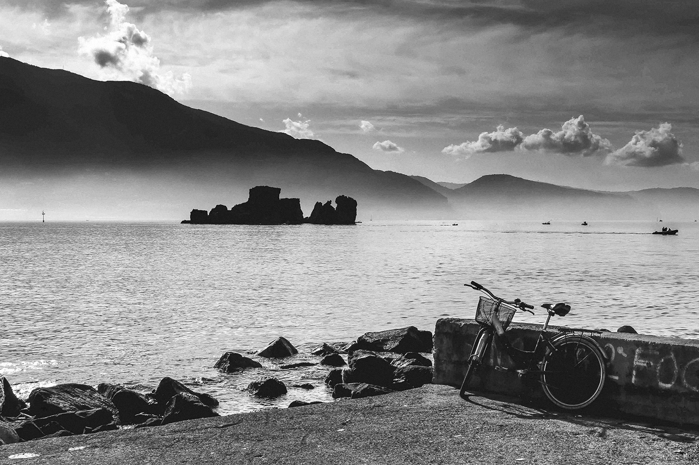 | Immagine in doppia valenza visiva ....chiusura in basso con il triangolo che accoglie la bici. ..ampio respiro nel l secondo piano , con l'orizzonte a disegnare in profondità il profilo delle montagne adagiate sull'acqua...monocromia di vasta gamma nella scala tonale del grigio ..miei complimenti veri. Gianni. |