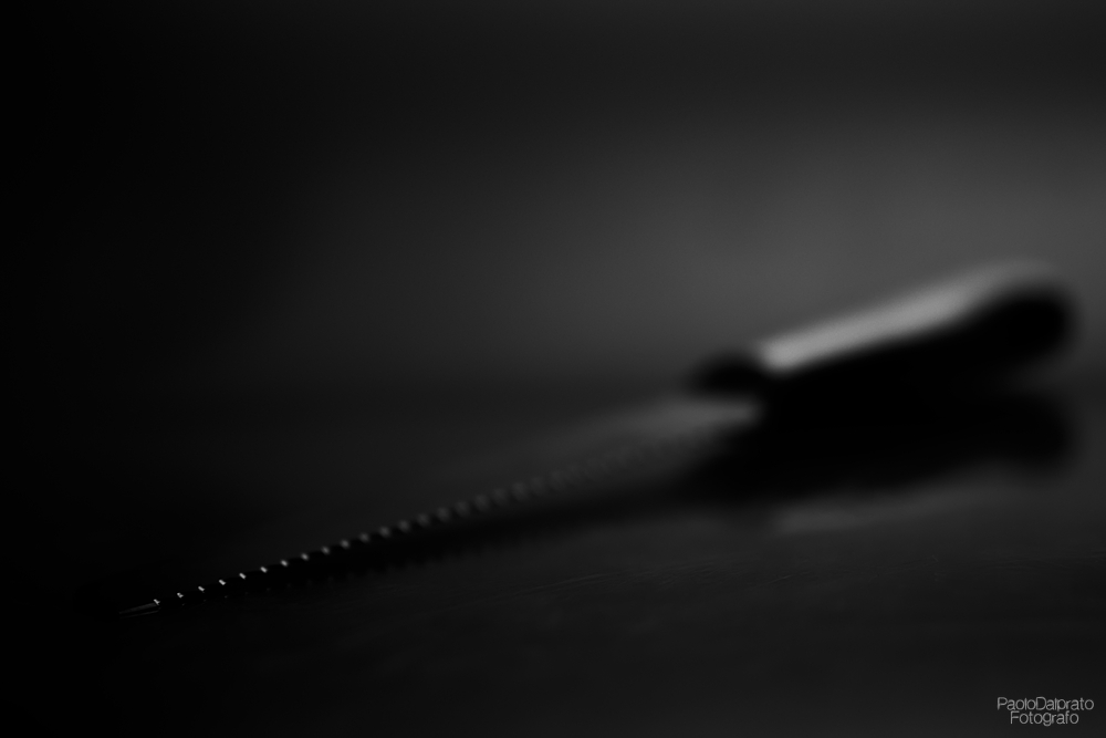 Il luccicare della seghettatura della lama, è un colpo fotografico da maestro, che interseca la penombra con grande forza.