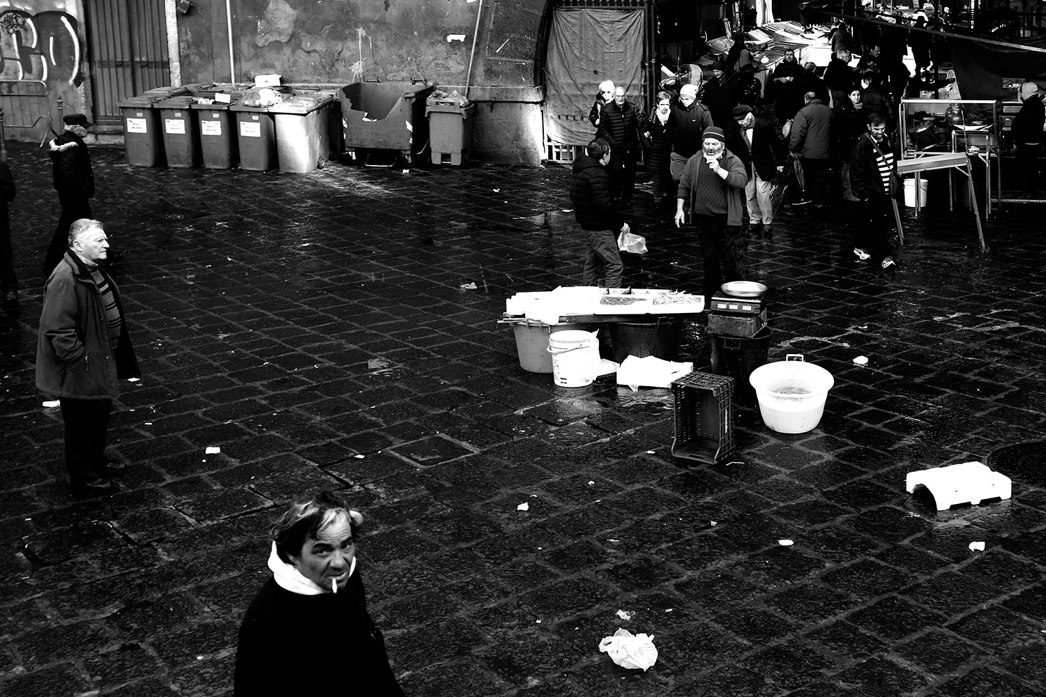 | La scena un po' caotica dell'angolo superiore dx si contrappone al vuoto dell'angolo inferiore sx e un po' disturba. Stringendo l'inquadratura sul gruppo di persone a dx la foto a mio parere avrebbe più forza, ma è solo un'opinione. Buono il b/n |