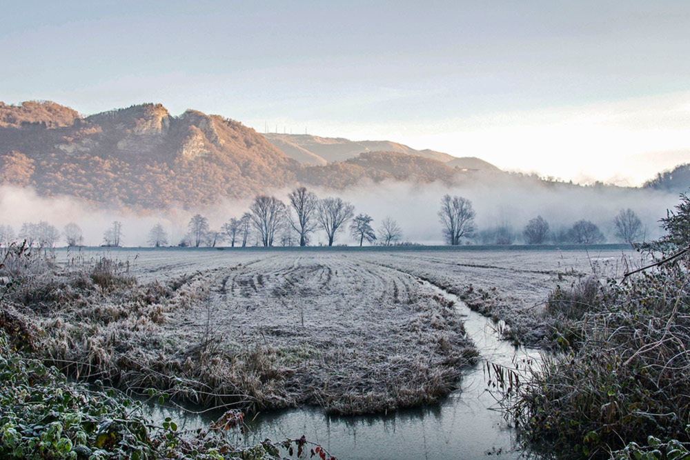 Fai tuoi i consigli di Clara , perché già con il suo intervento l'immagine guadagna tanto in dettaglio e incisività. E merita,merita davvero tanto,io la trovo stupenda Elis!Mi piace ogni piano che l'occhio va a scoprire,i campi disegnati dalla brina,gli alberelli raggruppati quasi a scaldarsi tra loro,con una soffice coperta di nebbia ad avvolgerli e i pendii dietro,illuminati da una delicata e soffusa luce... molto molto bella