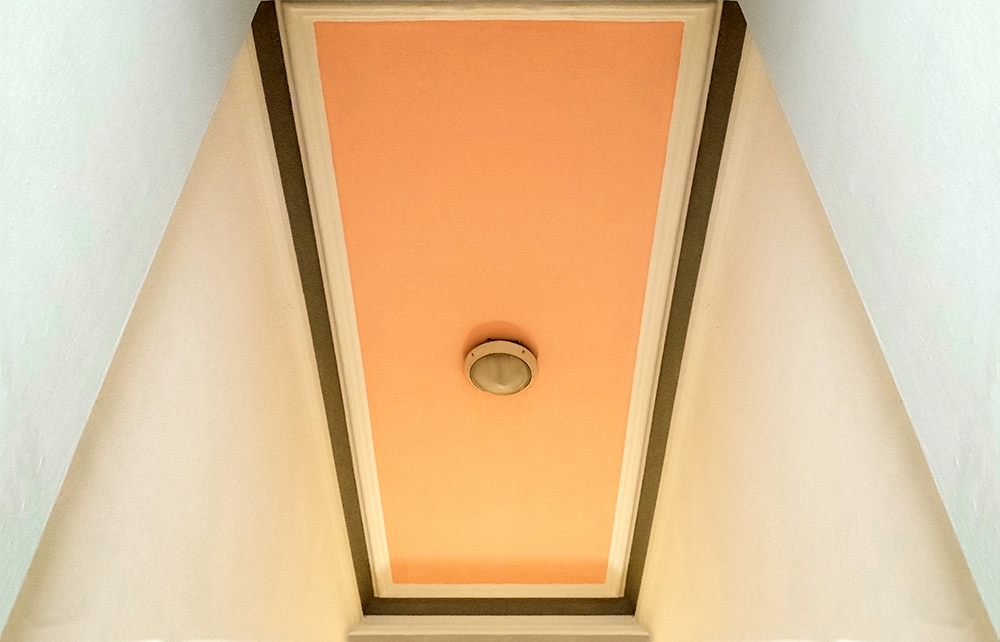 | Perfetta la simmetria dei due triangoli rovesciati che vanno ad incorniciare il soffitto del quale la lampada risulta essere centro focale...morbida la componente cromatica che alleggerisce l'insieme materico...una stellina.Ciao Gianni. |