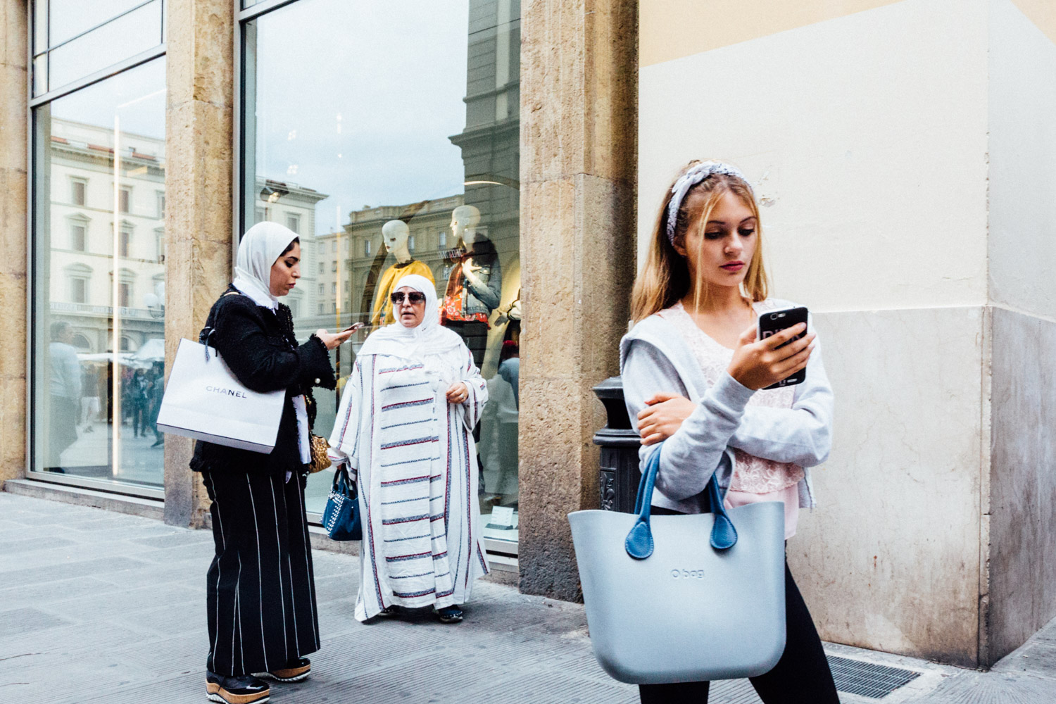 Una scena non comune, ripresa molto bene. Un confronto-scontro fra borse, telefoni e culture. Ciao