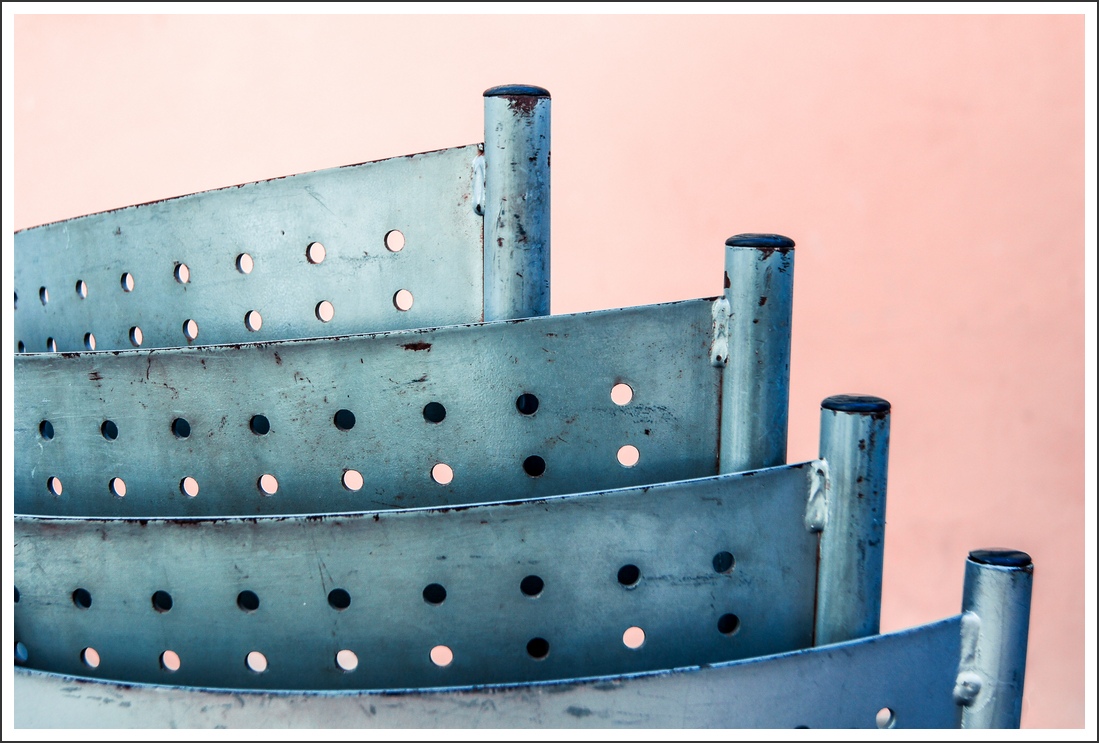 Penso che l'arma vincente di questa foto risieda nello sfondo più che nel ventaglio metallico, riesce ad ingentilire la dura materia impietosamente presentata nella sua approssimativa fattura, la progressiva messa a fuoco aggiunge profondità pur prediligendo il senso inverso.