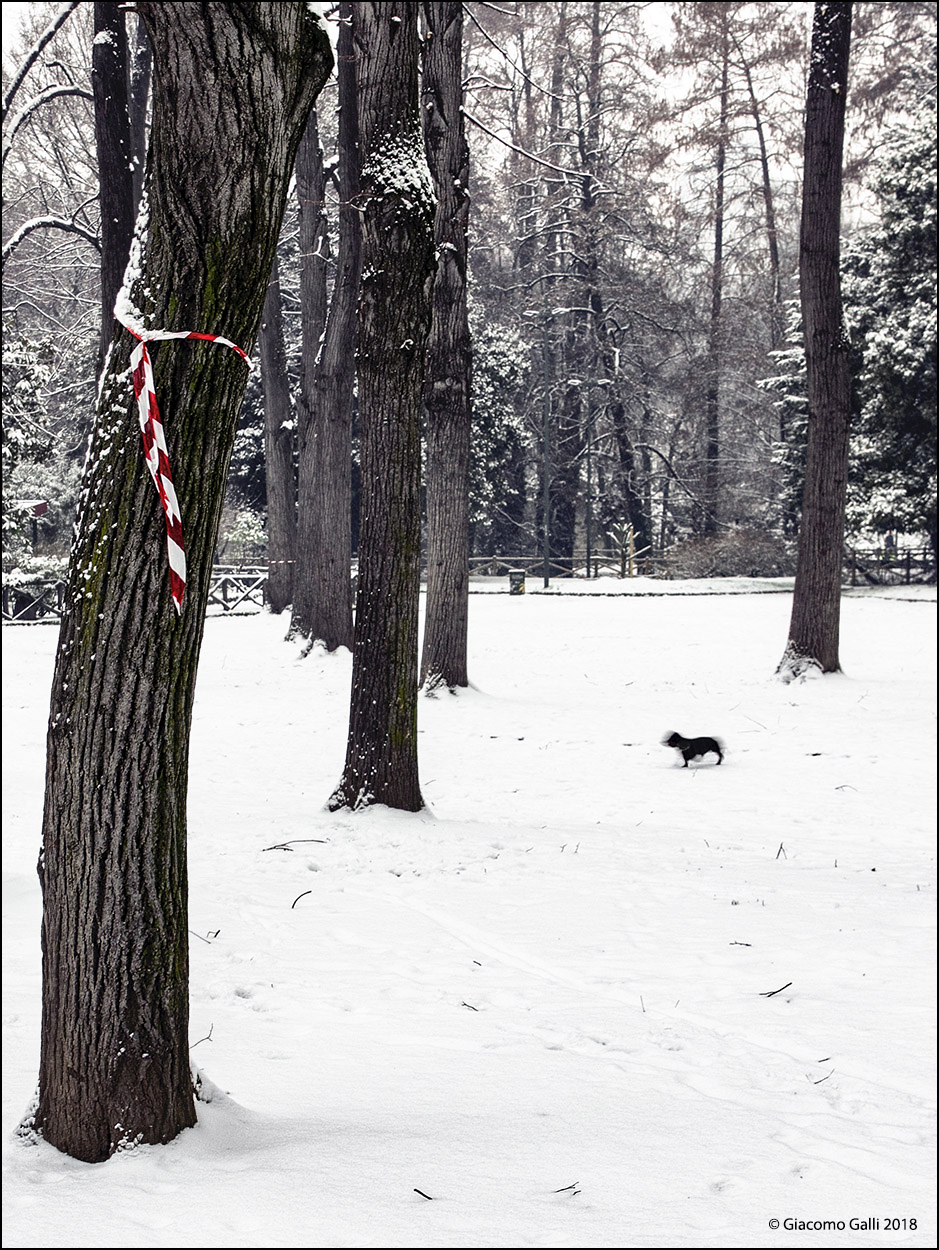 Mi piacciono molto i toni della corteccia e quel minuscolo cane fra la neve.
