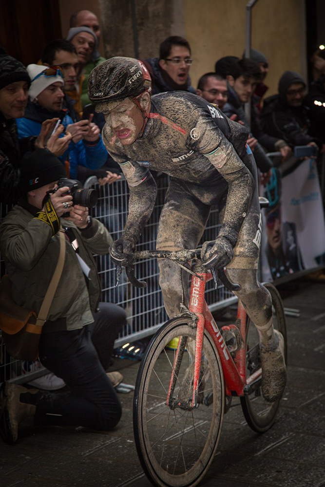 Splendida ! Da ciclista, ci leggo tutta la fatica, il freddo, lo sforzo, la determinazione di questo campione.. Da fotografa dico che peccato per il pezzetto di copertone tagliato ,e avrei aperto un po' di più per sfocare maggiormente il pubblico...resta una GRAN foto !
