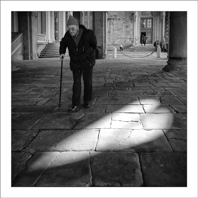 in foto di questo genere il rischio pietistico è in agguato; invece qui una felice sinergia di elementi solleva il risultato a piacevolezza sia estetica che concettuale; luce cardioide ben piazzata, sia nella geometria della foto che nell'illuminare quella grande pietra che richiama una lapide .. il nonno curvo, si, ma dallo sguardo reattivo .. il suo allontanarsi dalle persone raccontato senza retorica ..