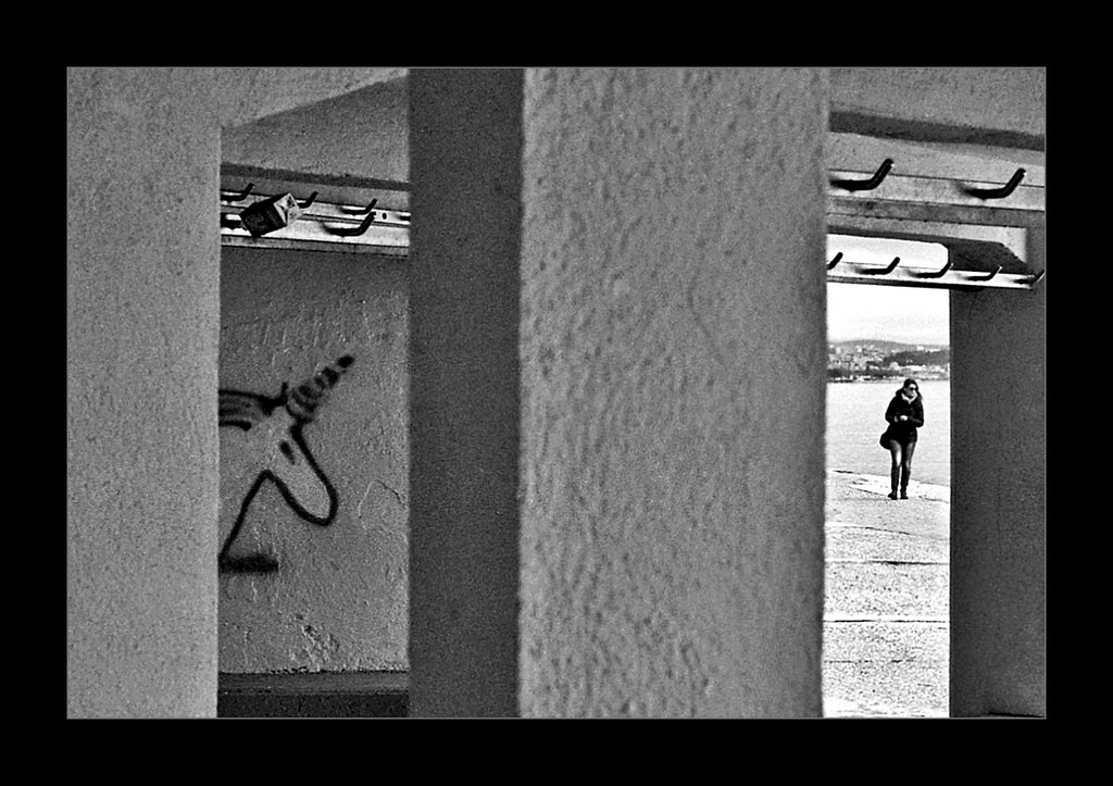 Ciao Sergio, animali disegnati sui muri in queste ultime due . Che si affacciano sulla scena nel tuo ormai proverbiale saper cogliere le piccole sfumature celate . Nella composizione, molto efficace, uno sguardo al mare dei protagonisti ed una sensazione di libertà oltre quel pilastro che pare precluderela. Si trova sempre uno spiraglio ..no?