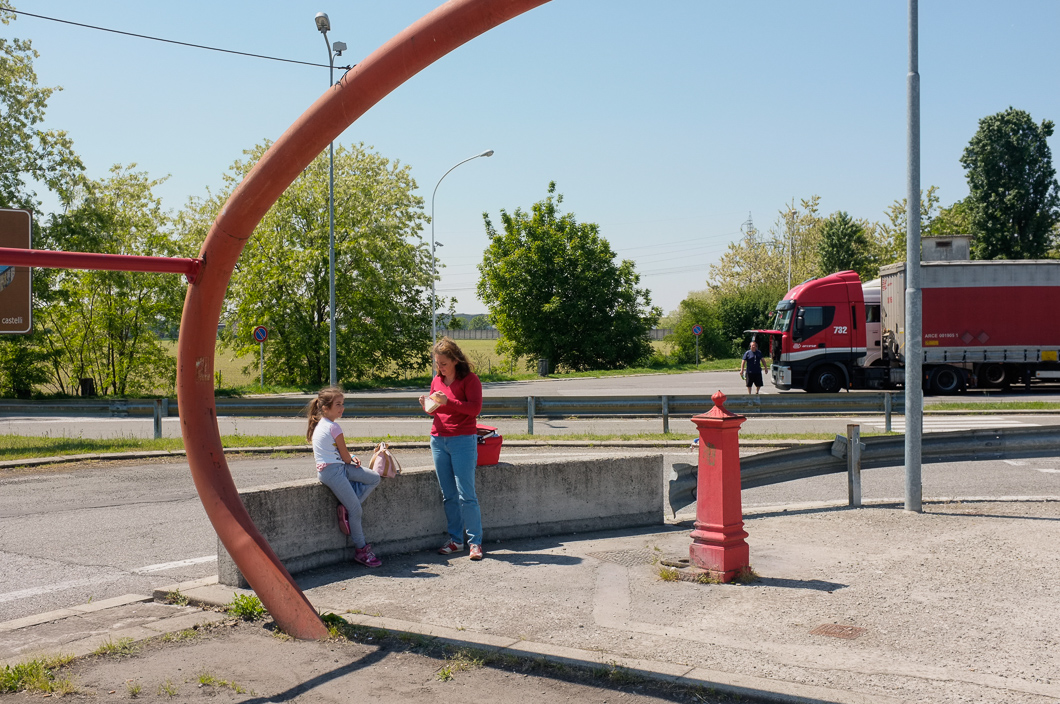 Rigore compositivo in cui si profila una scena non comune. Richiami cromatici che scandiscono la presenza umana, ritratta in questo momento di pausa.