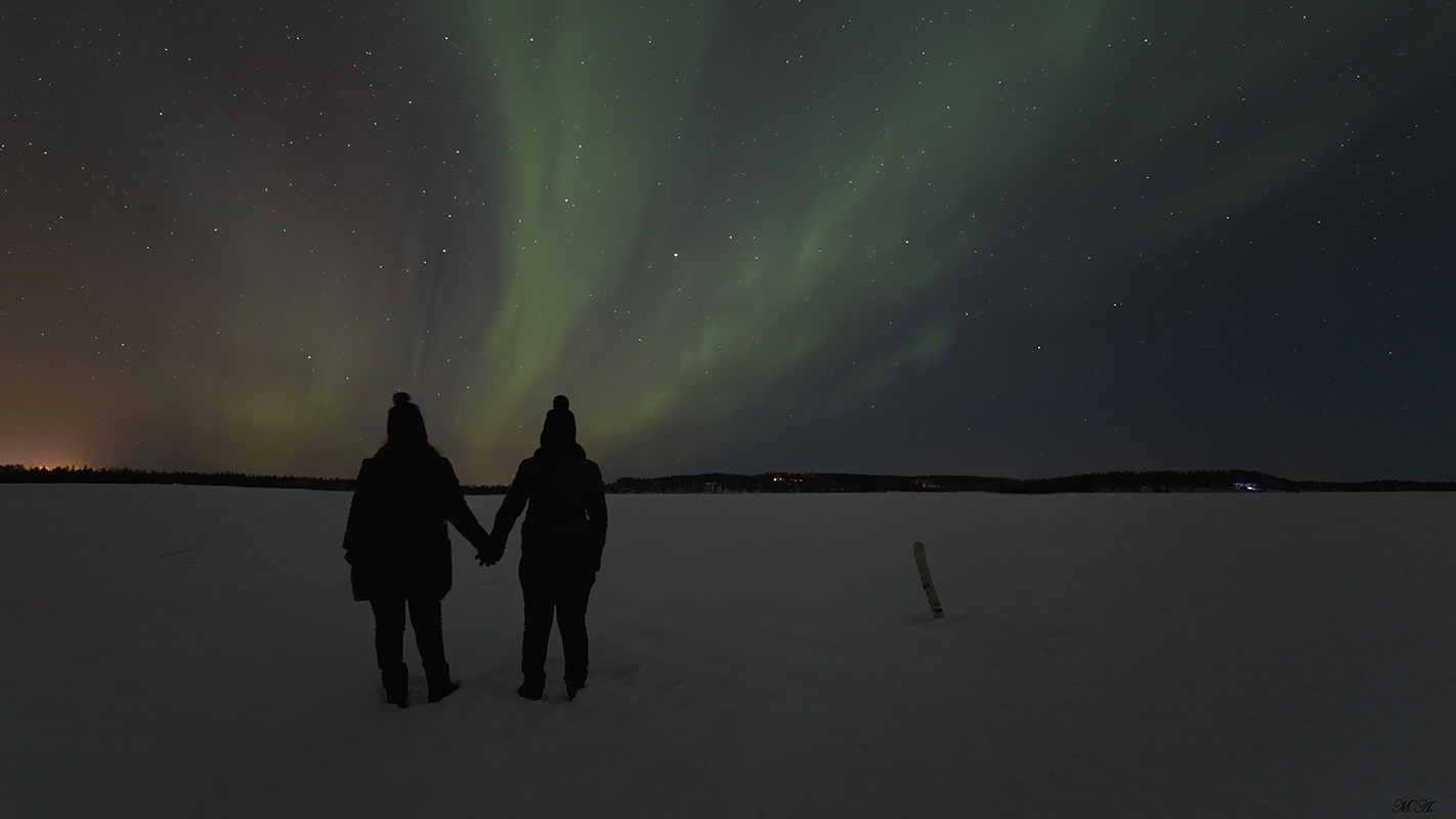 Prima notte di soggiorno in Lapponia, primo pdr, ovvero un lago ghiacciato in zona priva di inquinamento luminoso ma molto frequentata da escursioni perchè vicino alla strada. In questo scatto stavo con mia moglie e mia cognata e ci siamo spinti oltre, proprio sul lago per uscire dal raggio di inquinamento luminoso degli altri presenti sul posto.