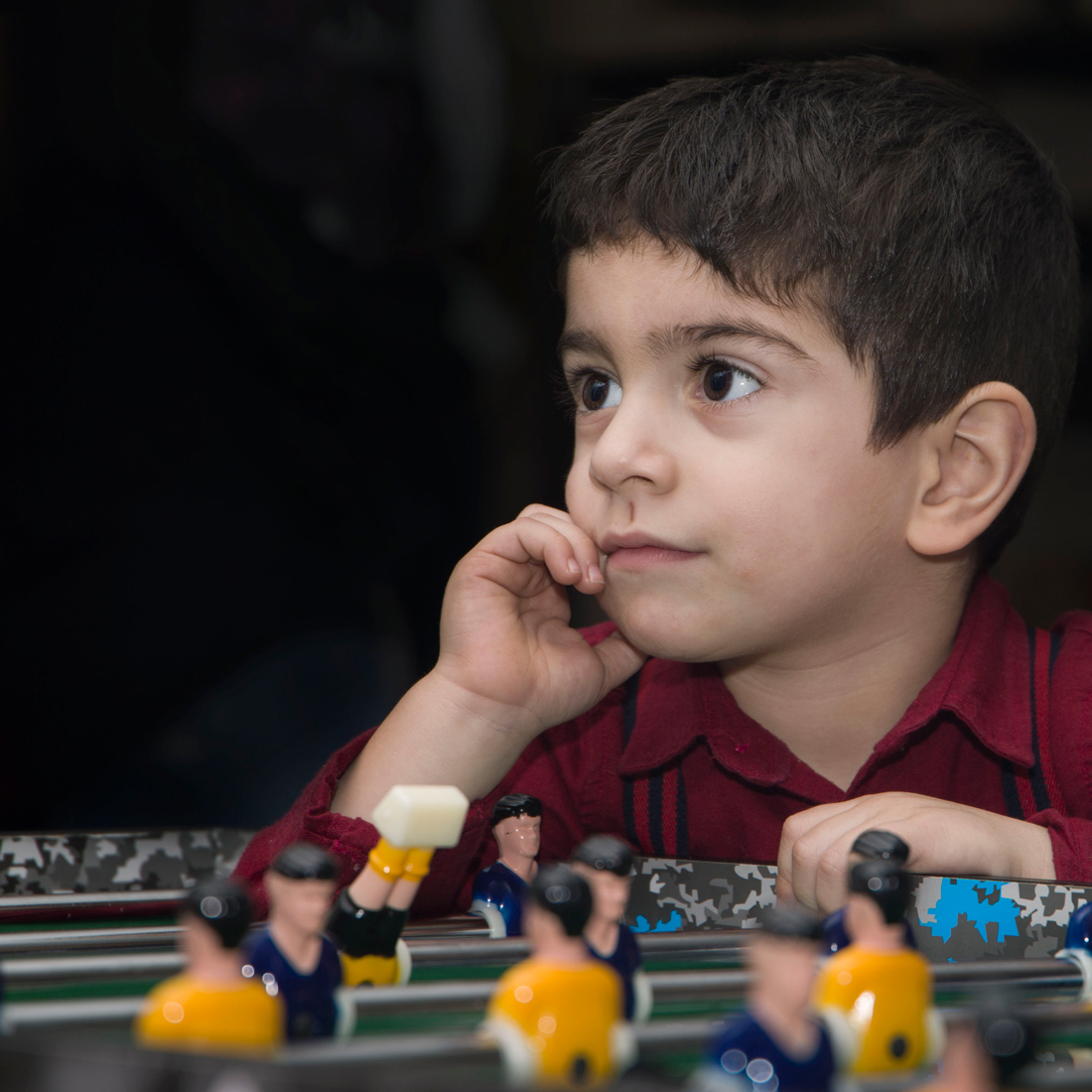 Sembra rapito da chissa cosa...probabilmente lo hai ritratto in un momento di pausa gioco . Pur non amando la luce flash diretto (vedi ombre del braccio sulla maglia e sotto il mento) tutto sommato hai fatto un buon lavoro . Clona quel puntino di luce flash nella sclera