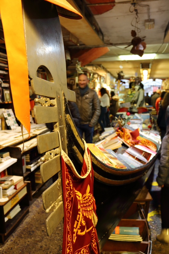 ciao Veronica! conosco benissimo quella libreria, dove è tutto troppo: troppo piena, troppo caotica, troppo ammassata, troppo piena di libri, troppo piena di gente, troppo BELLA ! In questa tua foto 'è un po' tutto sbagliato : hai fotografato in verticale ( e poteva andare bene se fotografavi fuori la scaletta di libri, che, appunto, sale in verticale.).: ma qui, dentro a un luogo così largo e basso, il verticale fa fatica... Lo hai fatto per fotografare il decoro della gondola ? Ok, allora perché lo hai tagliato in alto ? Hai tagliato anche in basso la bandiera della Repubblica Veneziana.. L'unico soggetto che risalta in questa foto...è il turista che ride, nelle sfondo, sfocato ...